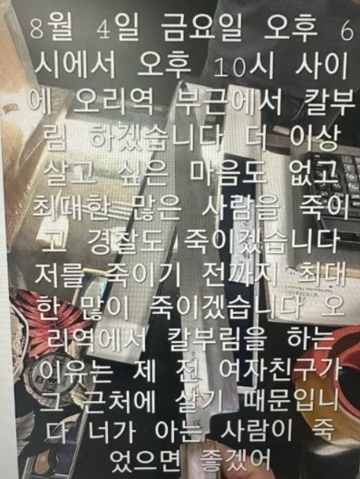 사건 이후 온라인 커뮤니티에는 다음날 오리역에서 새로운 칼부림을 예고하는 글이 확산되고 있습니다. 해당 게시글에는 "8월 4일 금요일 오후 6시에서 오후 10시 사이에 오리역 부근에서 칼부림하겠다"며 "최대한 많은 사람을 죽이고 경찰도 죽이겠다"는 무서운 내용이 포함되어 있습니다.